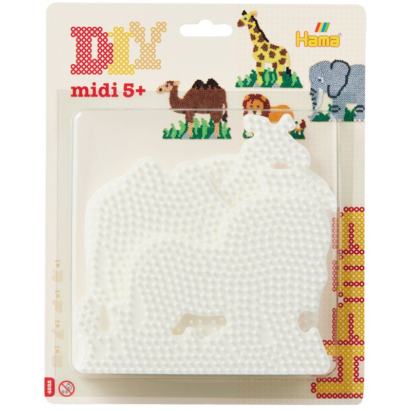 W zestawie Hama 4582 znajdują się 4 duże podkładki uzupełniające do koralików Midi w kształtach: słoń, lew, żyrafa i wielbłąd. Podkładki są koloru białego.